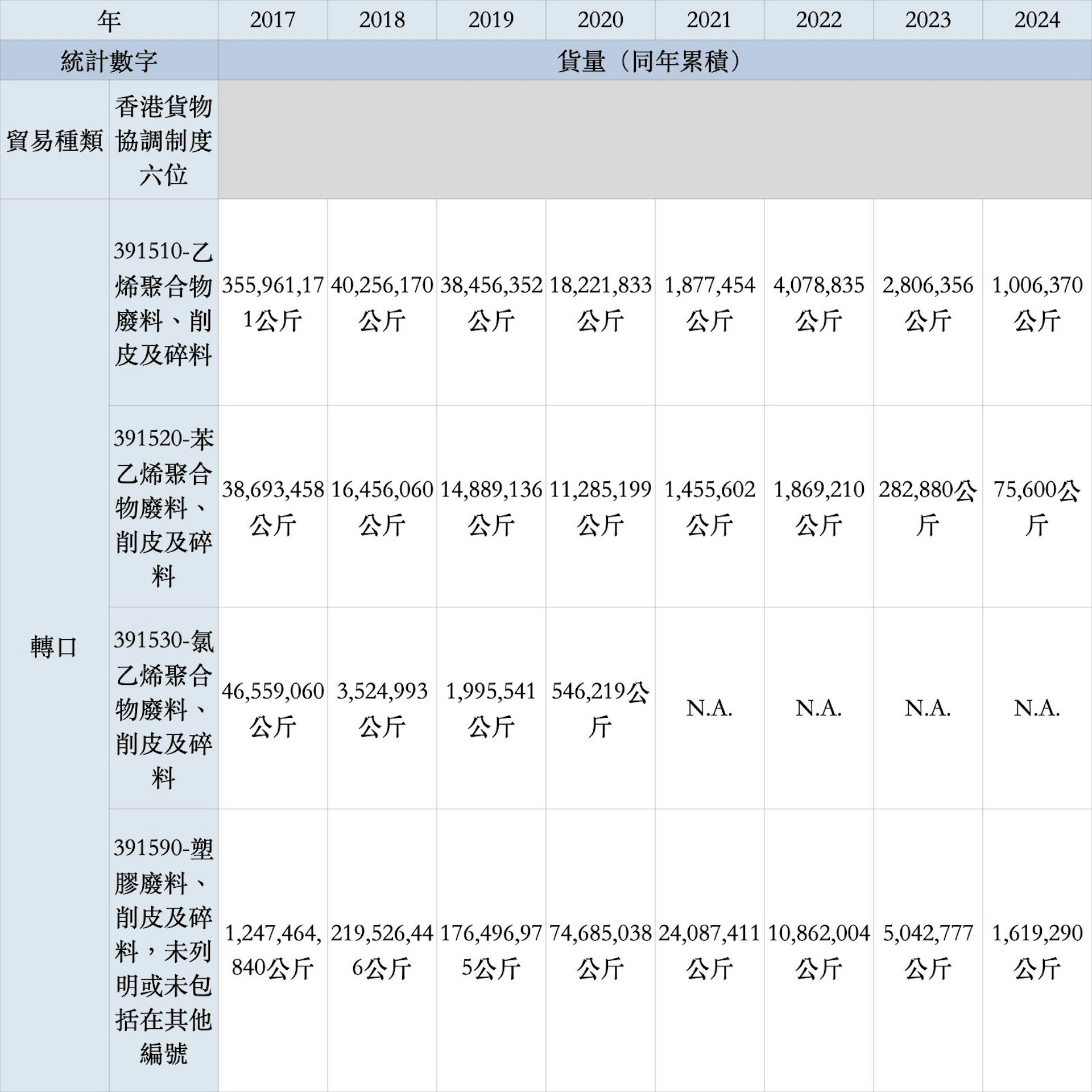 表一:2017 - 2024 年各種廢塑膠的轉口總量(來源:政府統計處貿易統計網上互動數據發布服務)