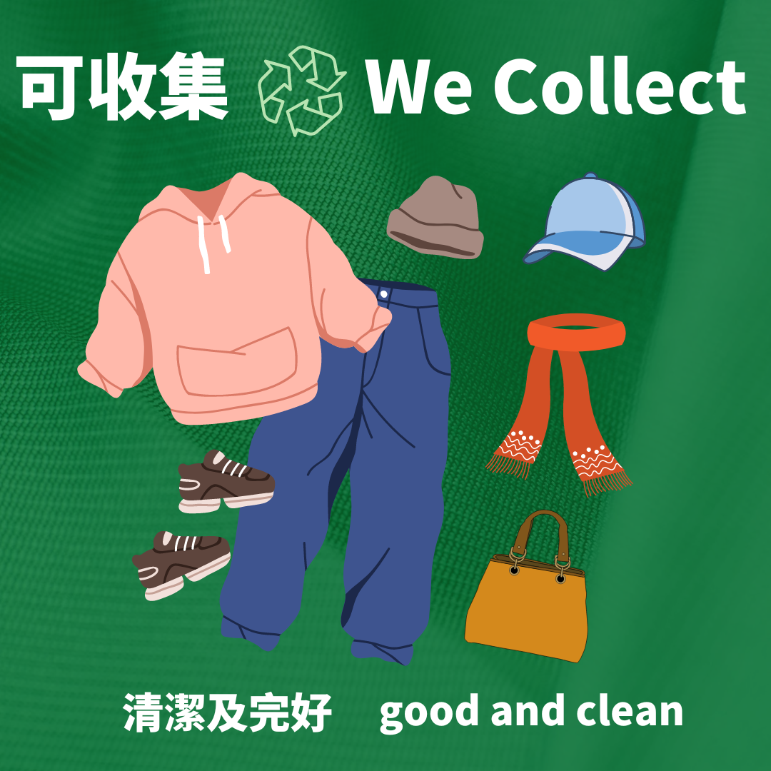 我們可收集基本清潔及完好的衣物、手袋、背包、帽及頸巾及鞋。
