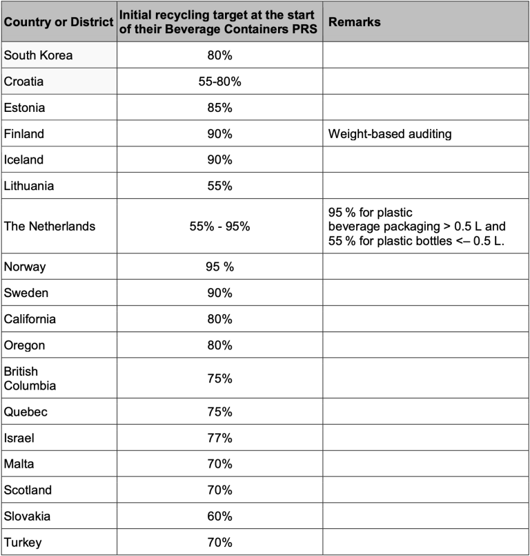 The Green Earth has analyzed 18 countries and regions with adequate experience in executing beverage containers PRS. They have an average of 75% recycling target, and most of them set their recycling targets to at least 70%. Refer to Appendix C for details.