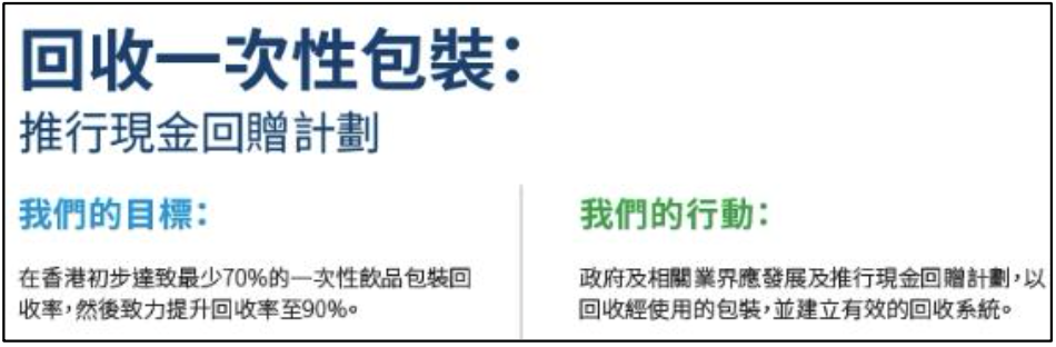 在香港龍頭飲品商帶頭下,各飲品業者應訂定進取的回收目標,並定期公布回收數據。由於國際 間已証明回收非解決塑膠污染良法,有必要同時在披露塑料包裝用量、訂定減塑目標、重用包裝 等源頭環節加倍努力。