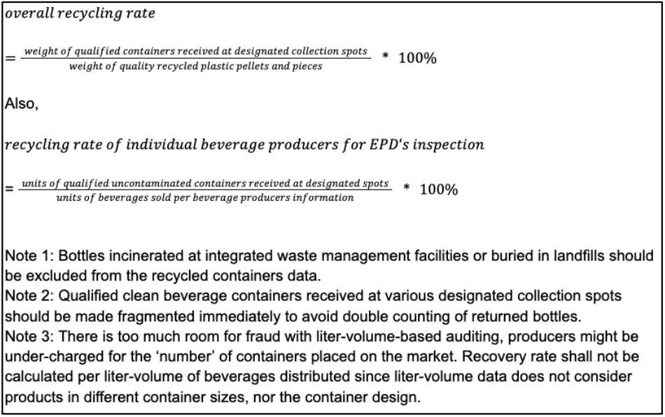 飲品生產商及 SO 的回收率數據應由署方認可的獨立第三方顧問在每個季度審核一次,以便合時 完成數據分析和發佈。整體回收率應每年在公開的數據平台上公佈,以供公眾審查。 綠惜地球建 議回收率公式應為: