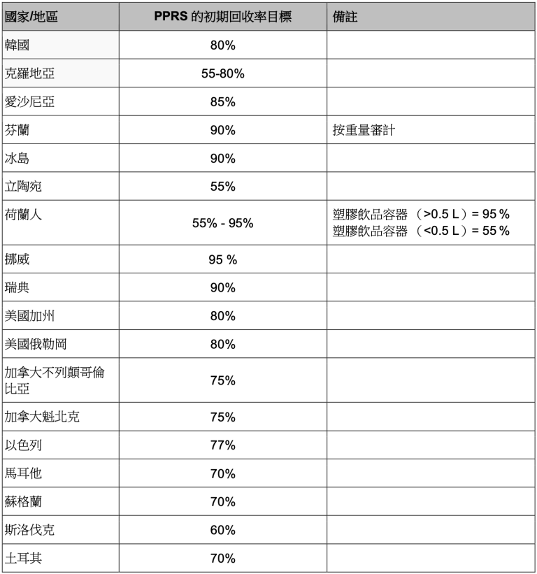 本會分析了 18 個具有足夠 PPRS 執行經驗的國家和地區。 他們平均有 75% 的回收目標,其中大多數將回收目標設定為至少 70%。有關詳細信息,請參閱附件 C。