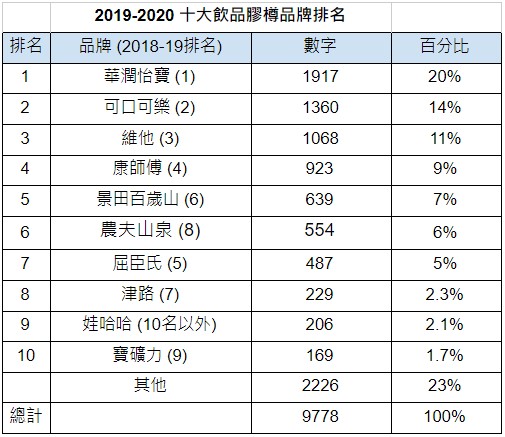 若以繁體字品牌區分,維他、可口可樂、屈臣氏本地三大品牌的廢膠樽,佔據70%的膠樽量。簡體品牌排名上,頭五位的華潤怡寶、康師傅、景田百歲山、農夫山泉、可口可樂共佔總棄置量的75%。